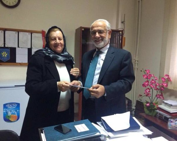 السيدة سنا الدرة تسلم مبلغ حفل الغداء لرئيس جمعية جامع البحر